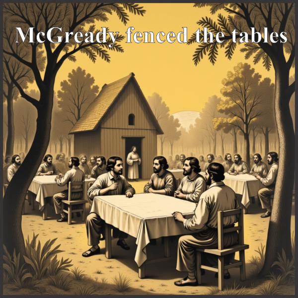 NOTE: James McGready (1758-1817) is a key Presbyterian Minister in the Presbyterian Sacramental Meetings where supernatural manifestations take place. To "fence the table" means to explain that only saved people can partake of the Lord's Supper. In actual practice, Presbyterian ministers merely asked people to answer a few questions from the Shorter Catechism. If the answers were correct, they were given a Communion Token to present at the Table.