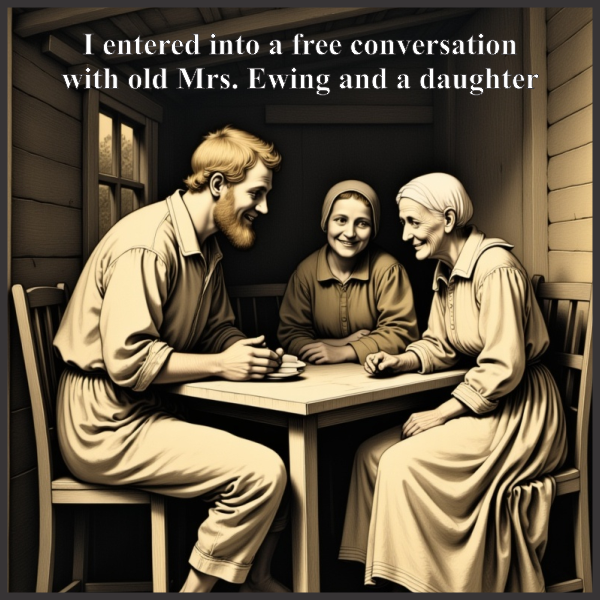 In evening I held society at Captain Porter's where about 20 people attended, and most of them seemed very devout. Saturday - An illiterate licentiate named Bell preached - the weather being exceptionally cold & the house being small and open, the people were very uncomfortable as to the external circumstances, and appeared to be generally inattentive. In the evening I spoke briefly on Matthew 5:3. Some of the people appeared very attentive and to hear with satisfaction - one of the Elders observed afterwards that his soul was much fed by the discourse.